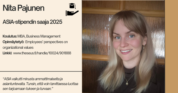 ASIA-stipendin saaja Nita Pajunen työskentelee HSW-managerina perheyrityksessä, jossa hän aloitti loppuvuodesta 2025. Pajusen vastuulla on yrityksen globaalin työhyvinvoinnin kehittäminen.