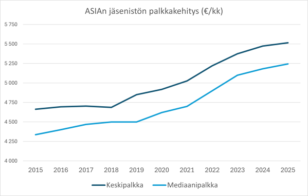 ASIAn tuore jäsenkysely kertoo myönteistä tarinaa palkkakehityksestä. Vuodesta 2015 vuoteen 2025 keskipalkka on noussut noin 4 663 eurosta yli 5 515 euroon kuukaudessa. Samalla mediaanipalkka on vahvistunut noin 4 337 eurosta reiluun 5 245 euroon. Kehitys on ollut erityisen ripeää vuosina 2021–2024, jolloin nousu kiihtyi sekä keskipalkassa että mediaanissa.